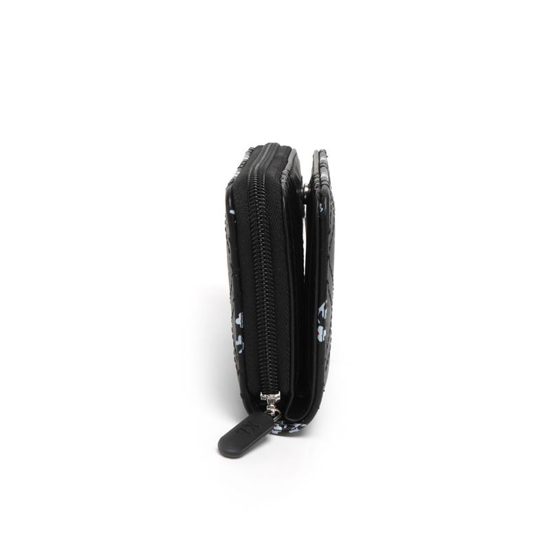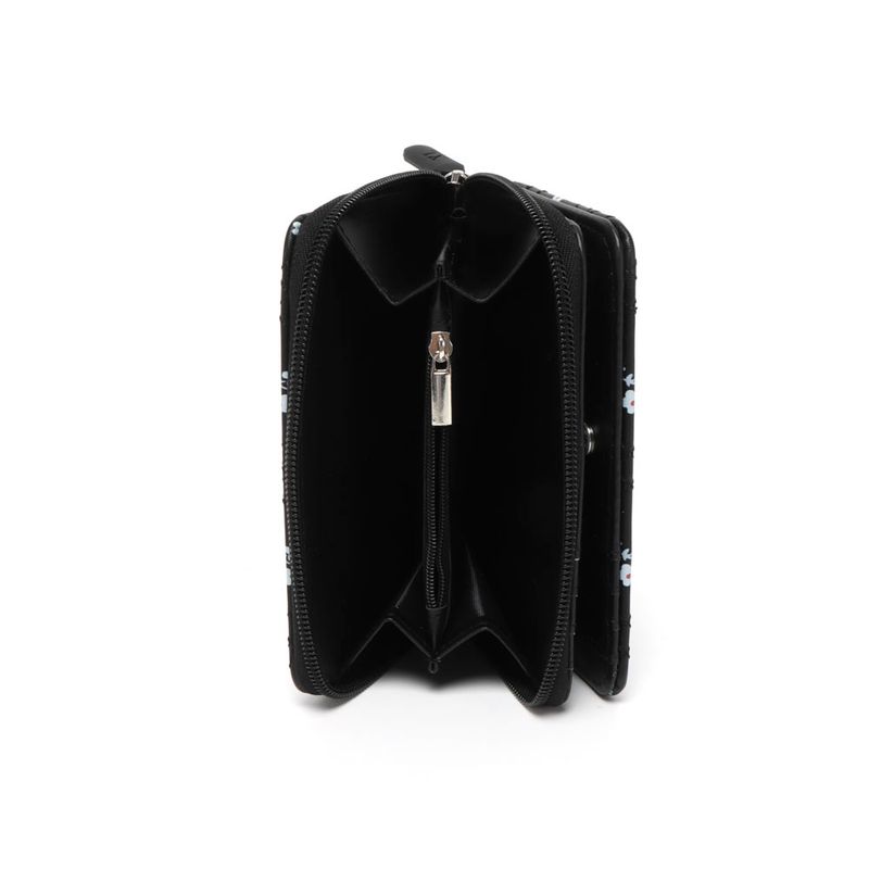 Estampa: Mini flores blancas con detalle en rojo sobre base negra.
