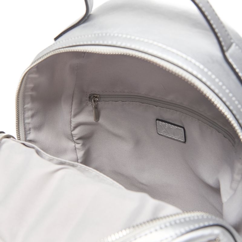 Interior forrado en tela gris con bolsillo interno con cierre.