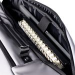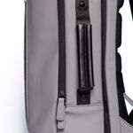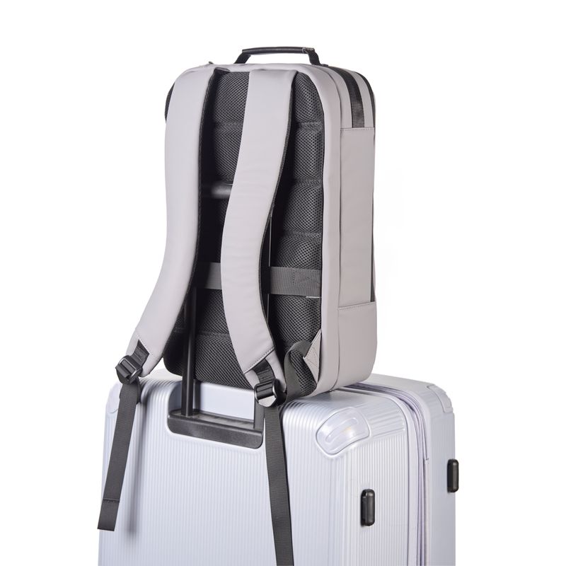 Espalda: Respaldo acolchado con malla respirable y banda para valija, ideal para viajes.