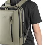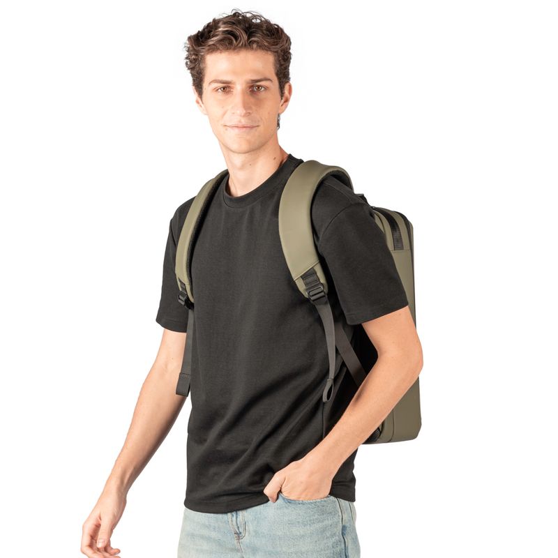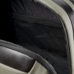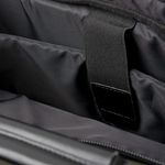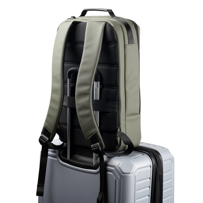Espalda: Respaldo acolchado con malla respirable y banda para valija, ideal para viajes.