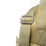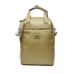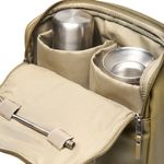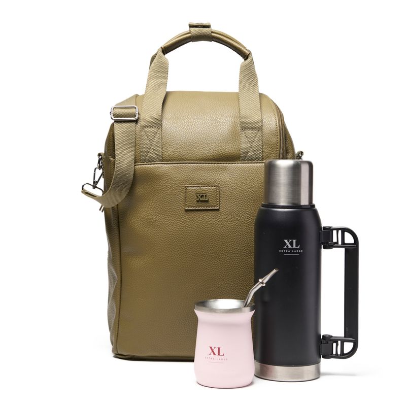 Diseño funcional tipo mochila matera, con múltiples compartimentos internos, laterales y traseros; estructura firme.