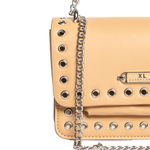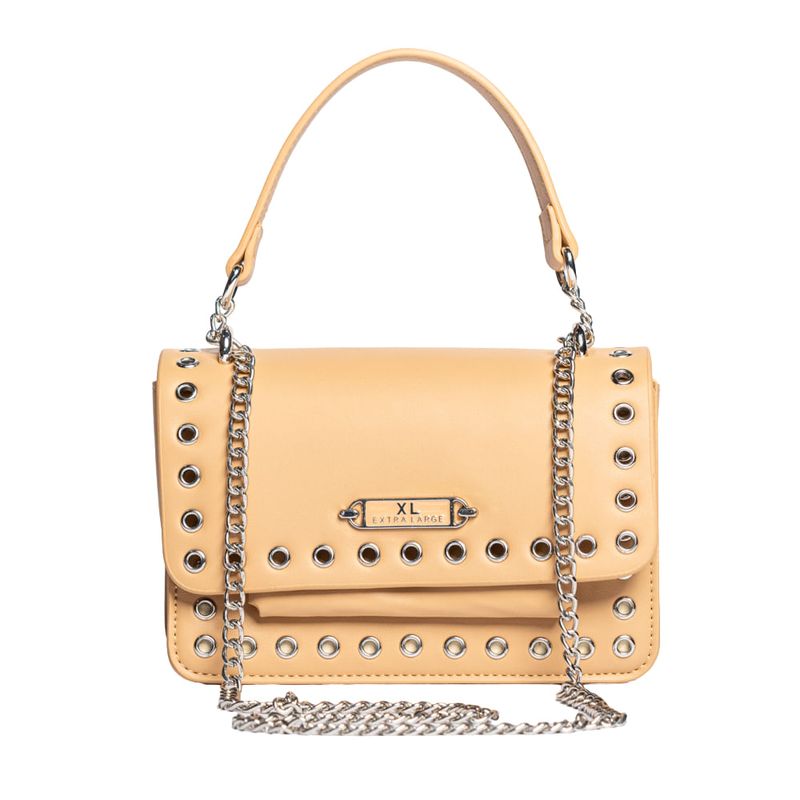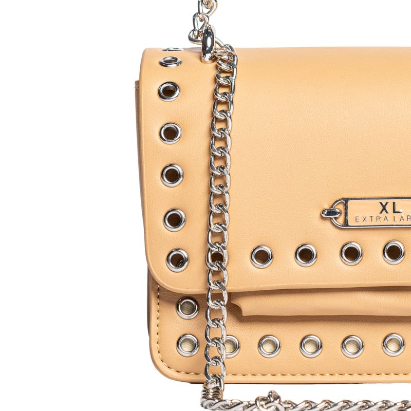 Diseñada en material símil cuero, se distingue por sus apliques metálicos tipo ojal en el frente y tapa, más una correa de cadena que aporta un aire urbano y sofisticado.